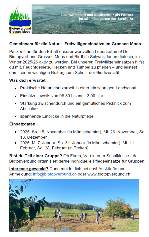 Daten: Die Einsätze sind immer halbtags. Start ist 08:30 Bahnhof Kerzers bis ca. 12:30, anschliessend gibt es ein Picknick: